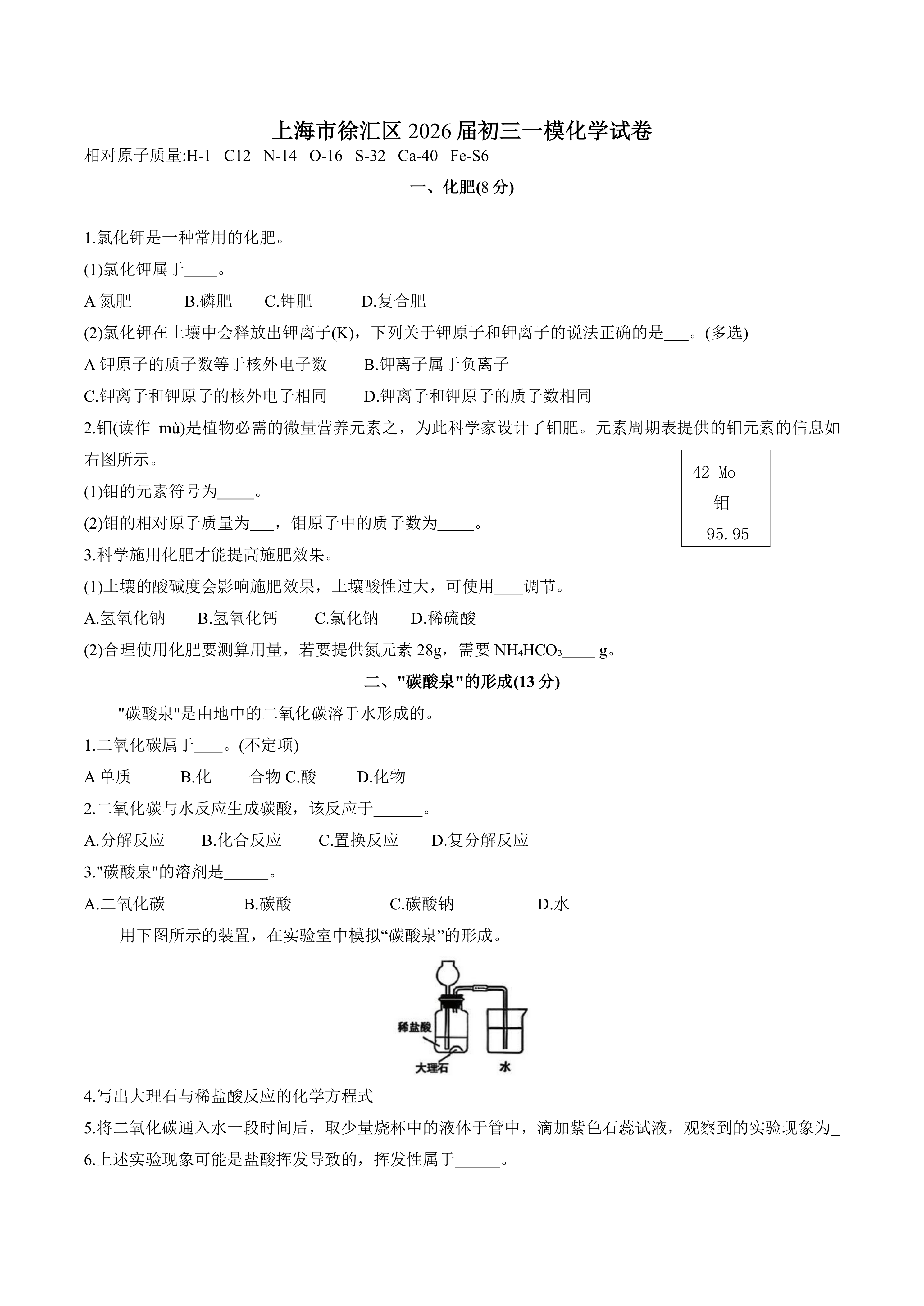2026年上海市徐汇区九年级中考一模化学试卷(含答案) 时间:2026-04-08 热度:°C 加入收藏 我要投稿 点赞() 2026一模huaxue 上一篇:2026年上海市杨浦区中考英语一模试卷(含答案) 下一篇:返回列表
